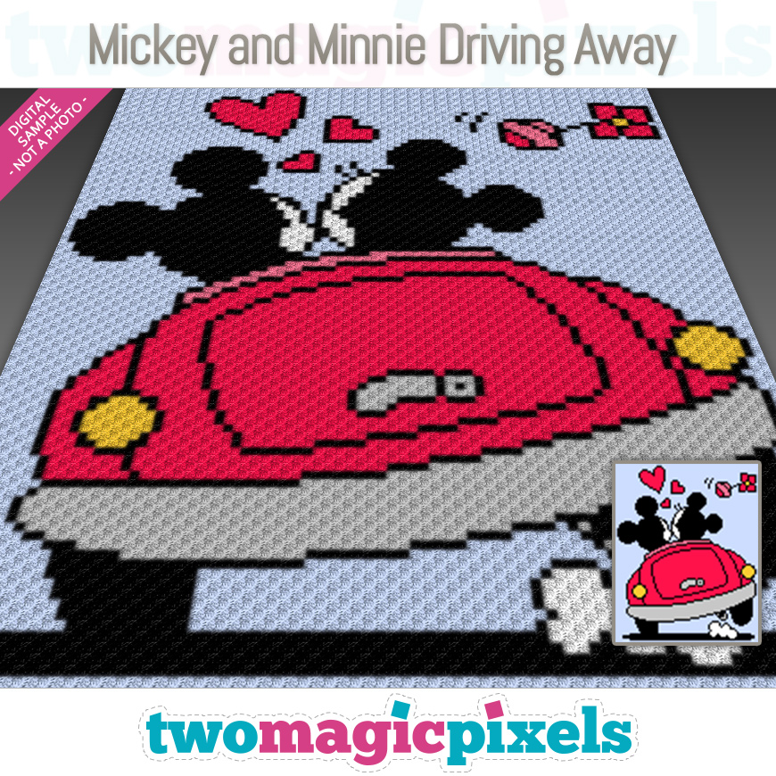 "Mickey and Minnie Driving Away" is a digital graph (available in PDF format only) that can be used to crochet a blanket using various techniques, such as C2C, Mini C2C, SC, HDC, DC, TSS or Bobble Stitch.Alternatively, you can use this product for cross stitch, knitting, hama beads, plastic canvas, diamond painting and other crafts.
